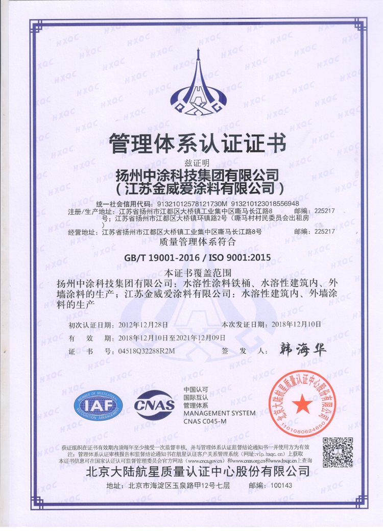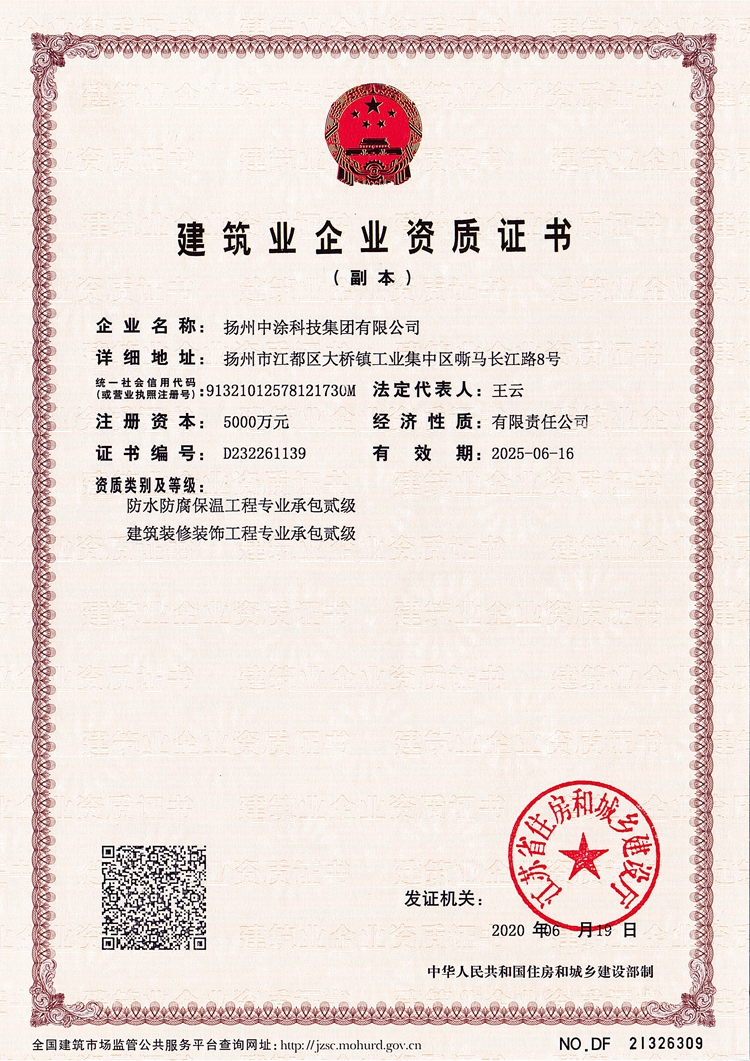 扬州中涂科技集团有限公司位于扬州市江都区大桥镇嘶马工业区,临近风景秀丽的长江,注册资本5000万元,是一家专业致力于涂料产品及其原料的研发、生产、销售并提供品牌加盟、技术转让等一站式服务为一体的现代化高科技企业。 现旗下包括:扬州中涂涂料研究院、扬州中涂装饰工程有限公司等企业单位,公司秉承“科技为先、质量为本”的原则,立足于高标准、严要求,拥有现代化的生产设备和检测仪器,年生产能力:乳胶漆30000吨、真石漆30000吨、多彩漆1000吨。